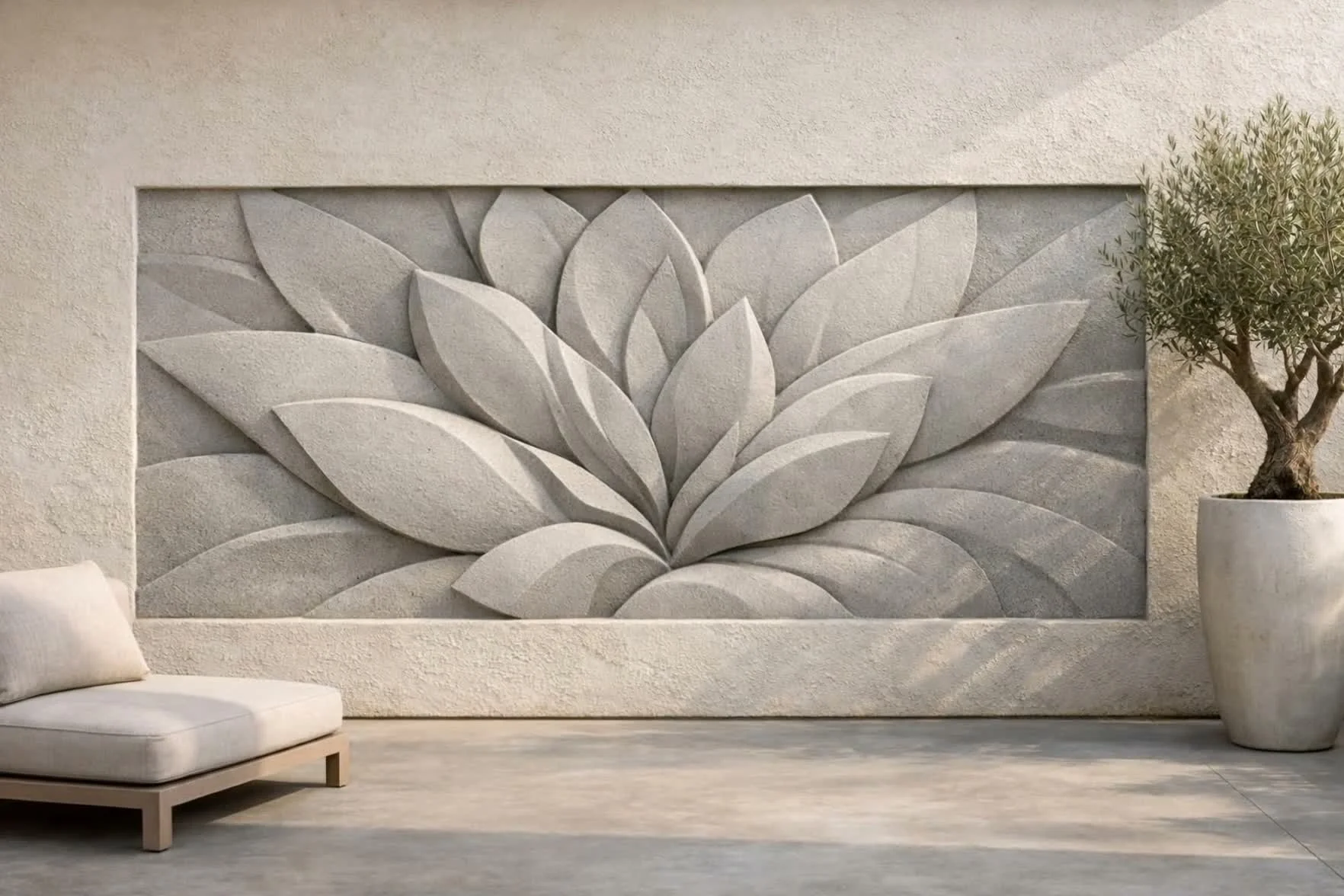 Vertical wall-mounted sculptures may be developed with heights ranging from architectural scale to monumental proportions